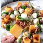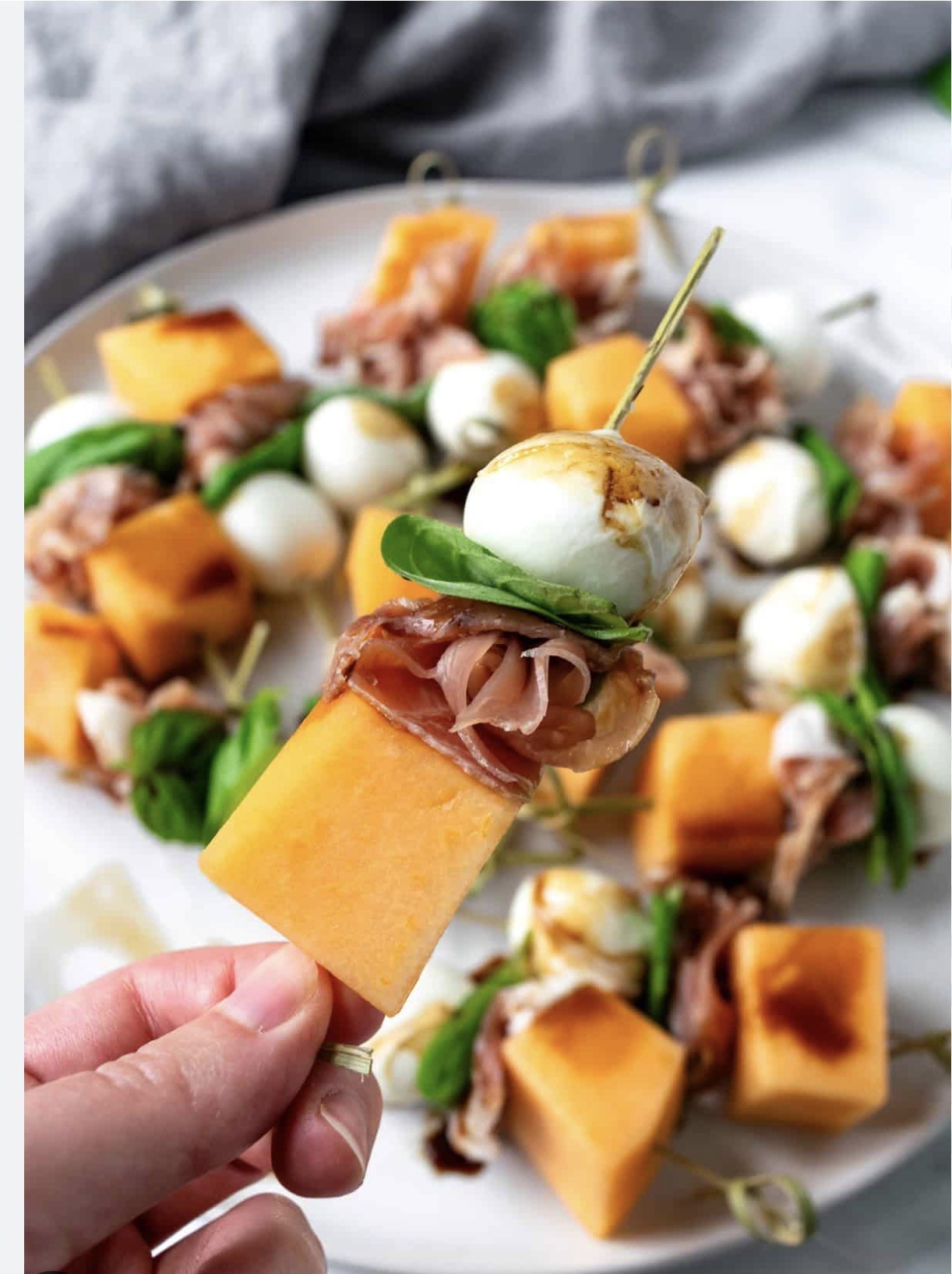 Serrano Ham, Rock Melon & Mozzarella (gf) A refined trio of Serrano ham, sweet melon and soft mozzarella finished with a balsamic glaze.